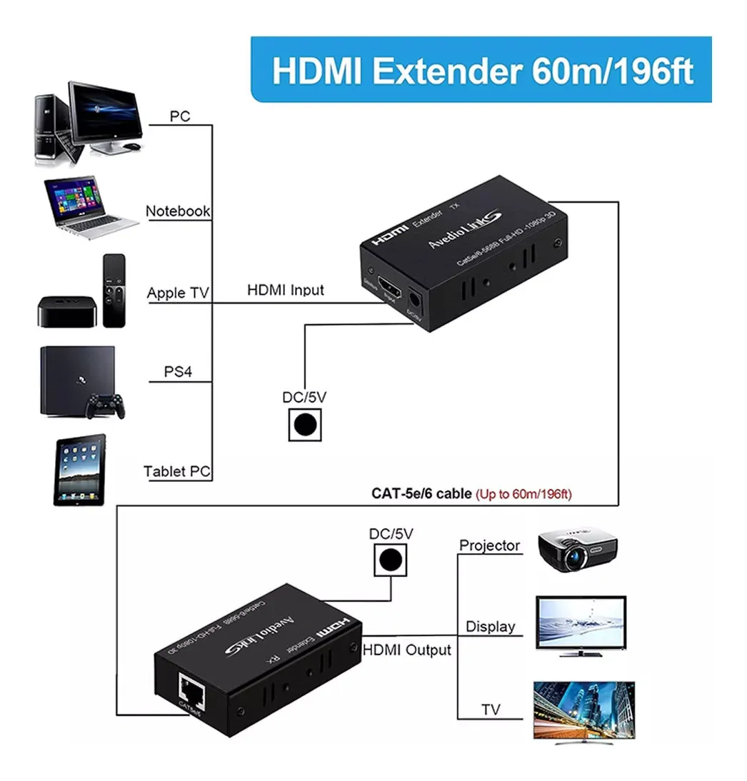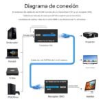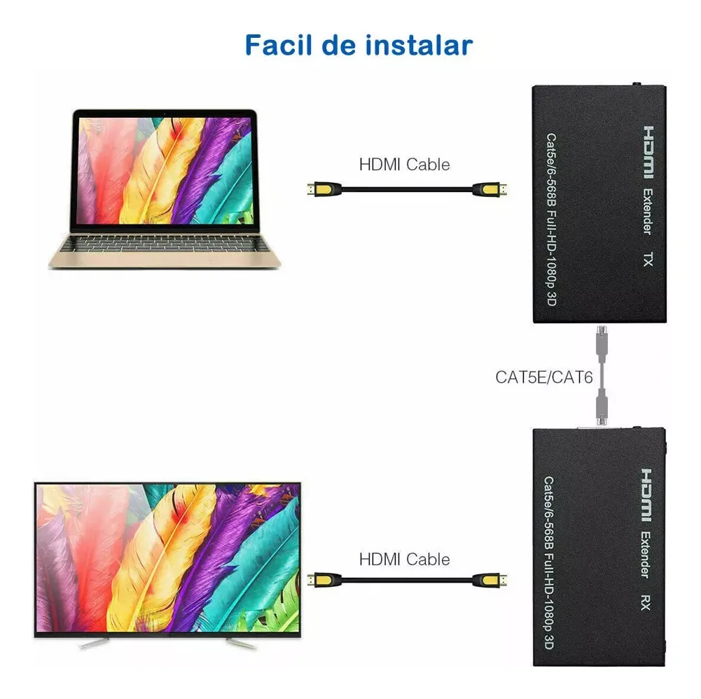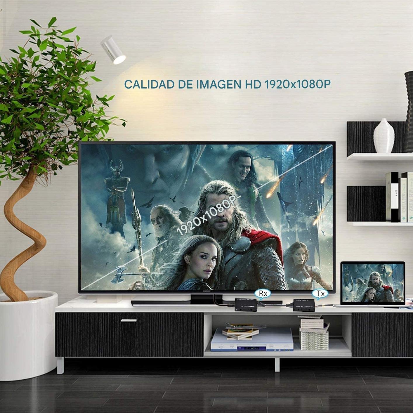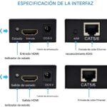 Este transmisor y receptor HDTV permite extender la señal de audio y video HDMI por cable desde un dispositivo a una pantalla distante, manteniendo excelente calidad de imagen y sonido. Es ideal para instalaciones donde no se puede usar un solo cable HDMI largo.