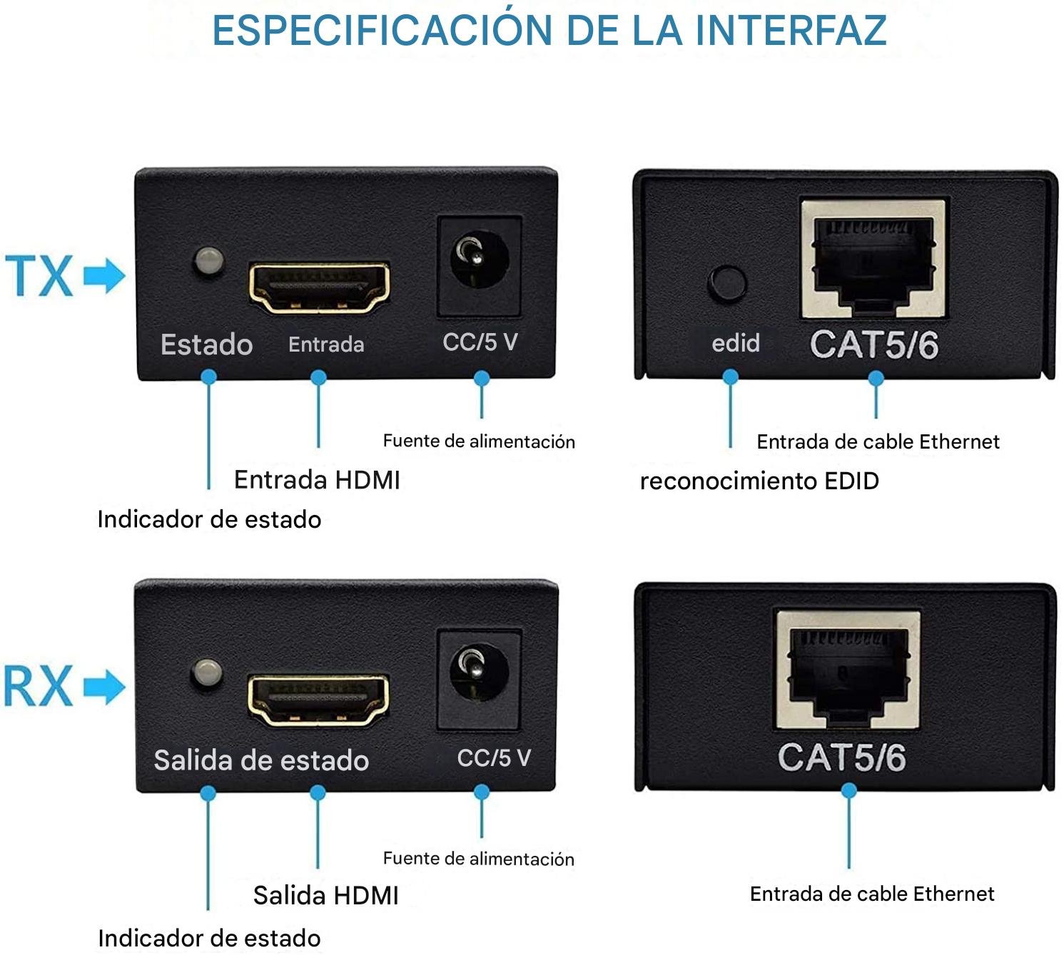 Extensor HDMI por cable: transmite señal de audio y video desde un transmisor a un receptor mediante cable de red (LAN).