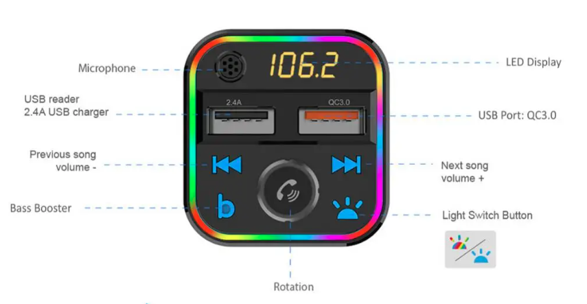 Sintonizador Emisor de Radio FM con Bluetooth – Sonido, Conectividad y Luces RGB