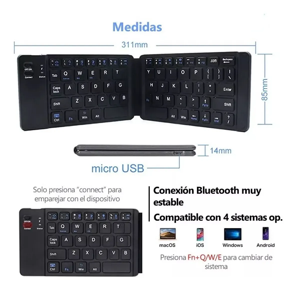 Compatible con múltiples dispositivos: notebooks, tablets y celulares que soporten teclado externo.